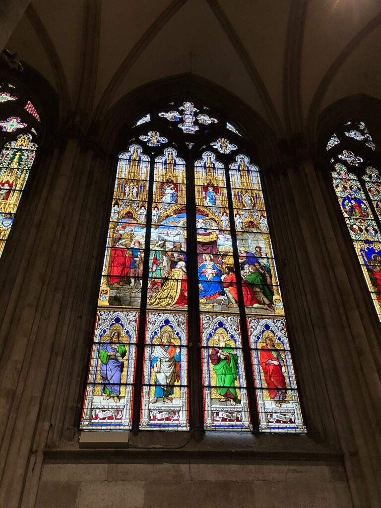 内部のステンドグラスがとても印象的でした。古い時代に作られた聖書の物語を描いた窓から、2007年に制作されたモザイク風の近代アート的窓まで、新旧のデザインが混在しています。この対照が、歴史の積み重なりを感じさせてくれます。