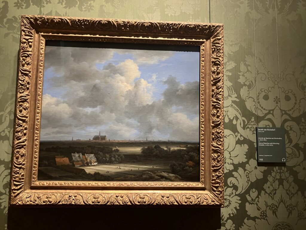 高い砂丘からハーレムの街を見下ろす風景。画面の3分の2を占める雄大な雲の空と、光と影のコントラスト、水面の反射が本当に美しく、オランダの風景画の到達点と言われる名画です。